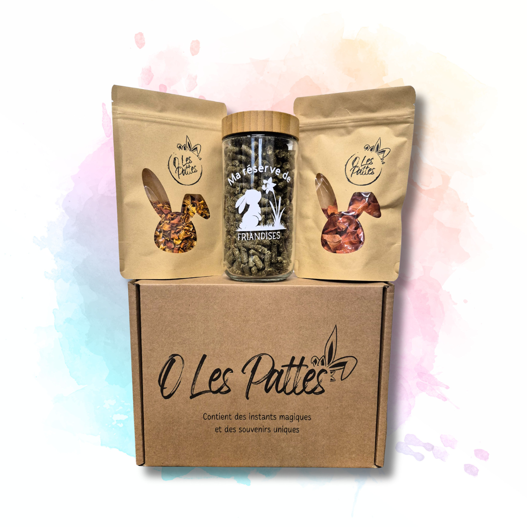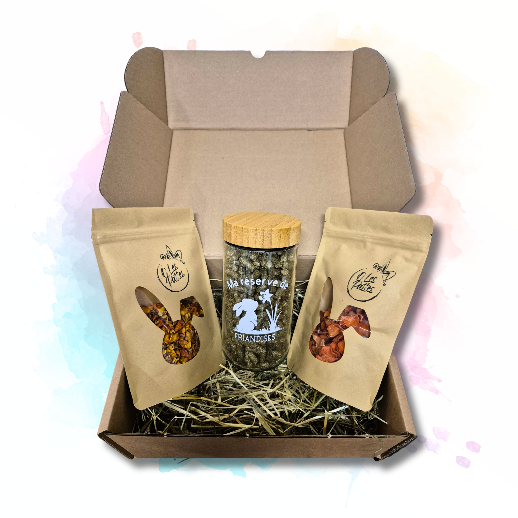 | Personnalisation | 1 mix de friandises (au choix) ou 1 jouet au foin (au choix) ou un pot à friandises au design lapinesque (le pot arrive vide) |
