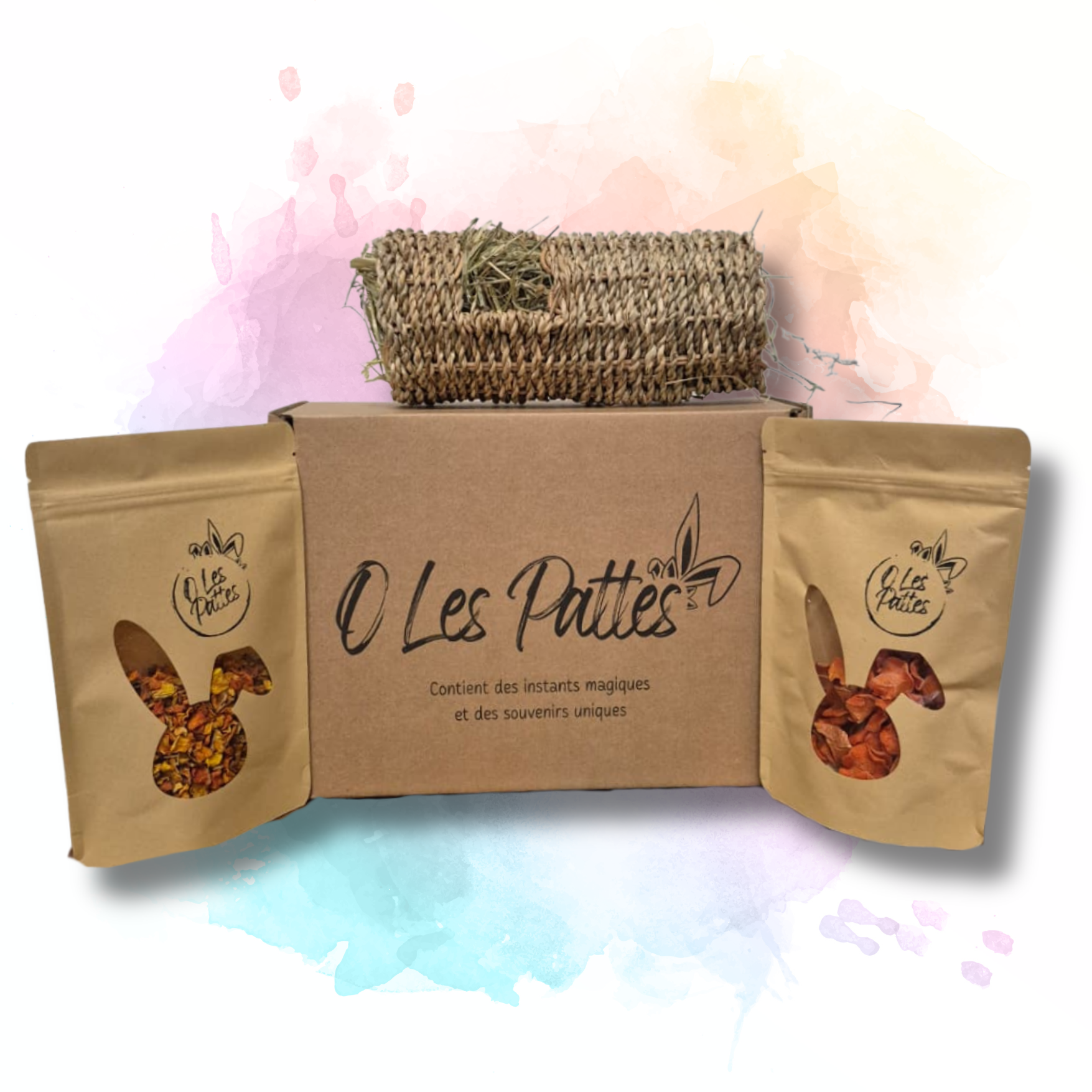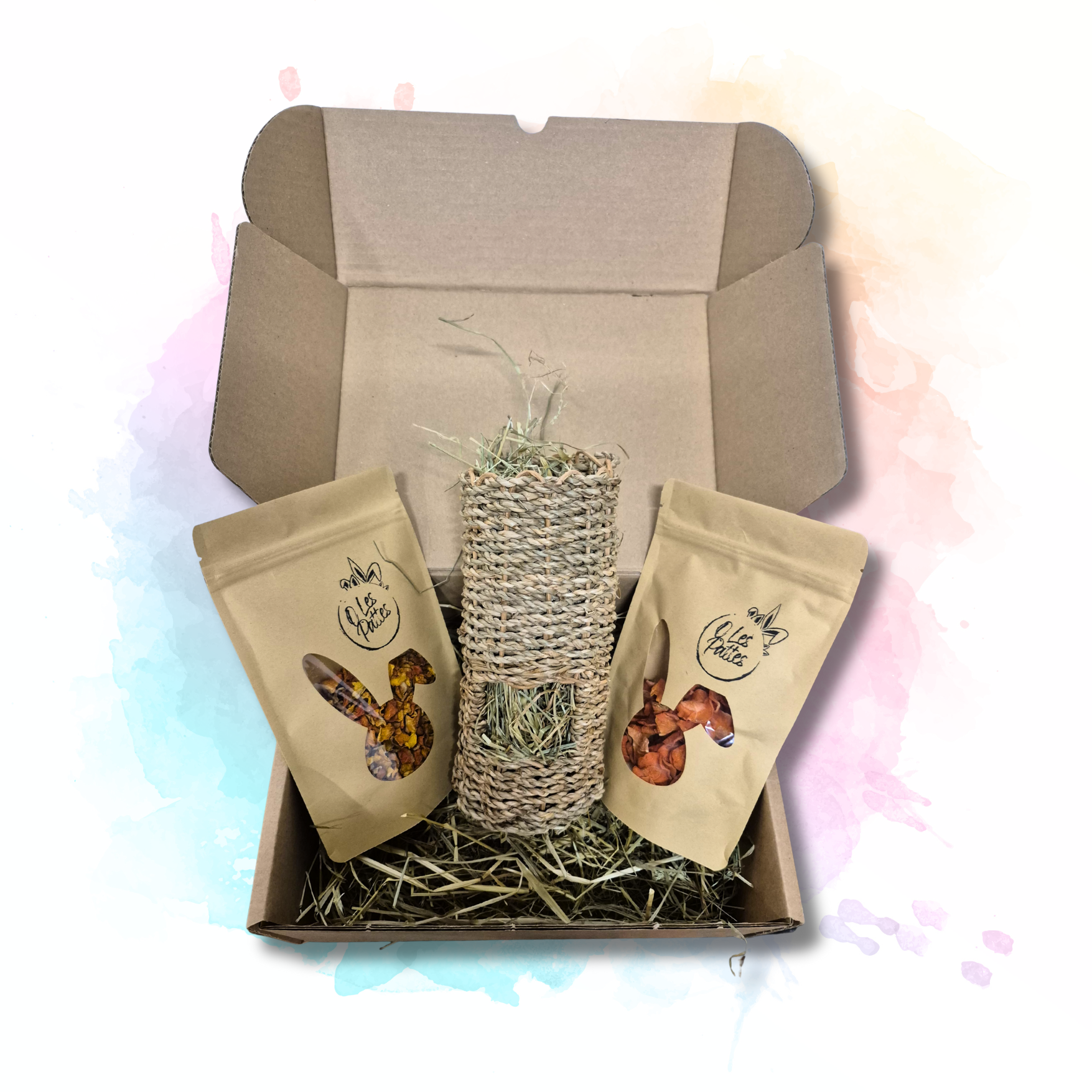 - 100% naturelle : friandises sans additifs ni sucres ajoutés, jouets en fibres végétales et garnies au foin.